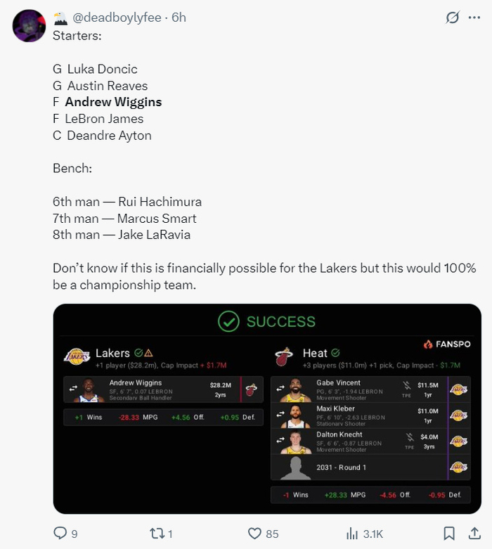 如果按照这套交易方案湖人还能腾出两个空位,湖人可以放眼买断市场,毕竟打8-10人轮换湖人也够用,湖人甚至可以让里夫斯打替补,八村垒继续打先发,维金斯去打二号位。