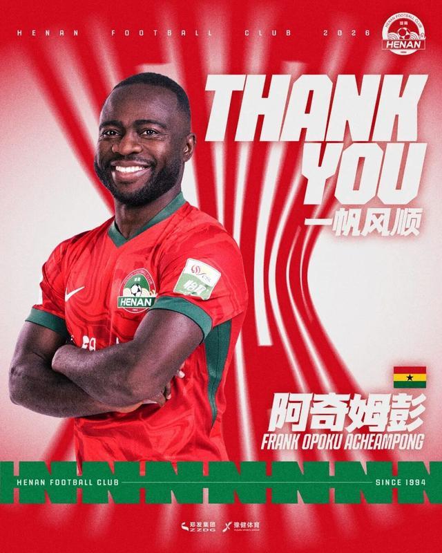 1月12日晚间,河南足球俱乐部发布公告,球员阿奇姆彭、卡多索、尹鸿博、牛梓屹、黄紫昌、刘斌、卢永涛、何小珂、宋润潼、张智豪合同到期,正式离队。阿奇姆彭,2024赛季加盟河南,共代表一线队出场59次,打进18球,送出7次助攻。卡多索,2025赛季租借加盟河南,共代表一线队出场30次,打进14球,送出6次助攻。尹鸿博,2013赛季首次加盟河南,2025赛季回归,...