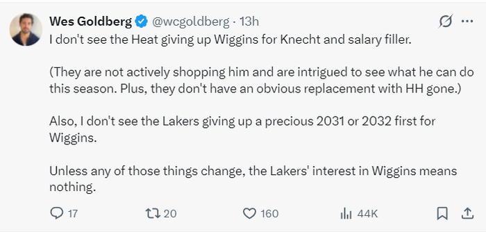 《体育画报》也跟踪报道,湖人队有意交易得到维金斯,热火队想要得到湖人队的首轮签而不是克内克特。