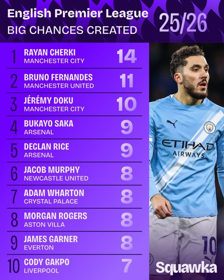 1月10日讯 数据机构squawka统计了本赛季英超创造重大机会情况,谢尔基力压B费居首。本赛季英超创造重大机会榜:1. 谢尔基(曼城),14次2. B费(曼联),11次3. 多库(曼城),10次4. 萨卡(阿森纳),9次5. 赖斯(阿森纳),9次6. 雅各布·墨菲(纽卡斯尔),8次7. 亚当·沃顿(水晶宫),8次8. 摩根·罗杰斯(阿斯顿维拉),8次9....